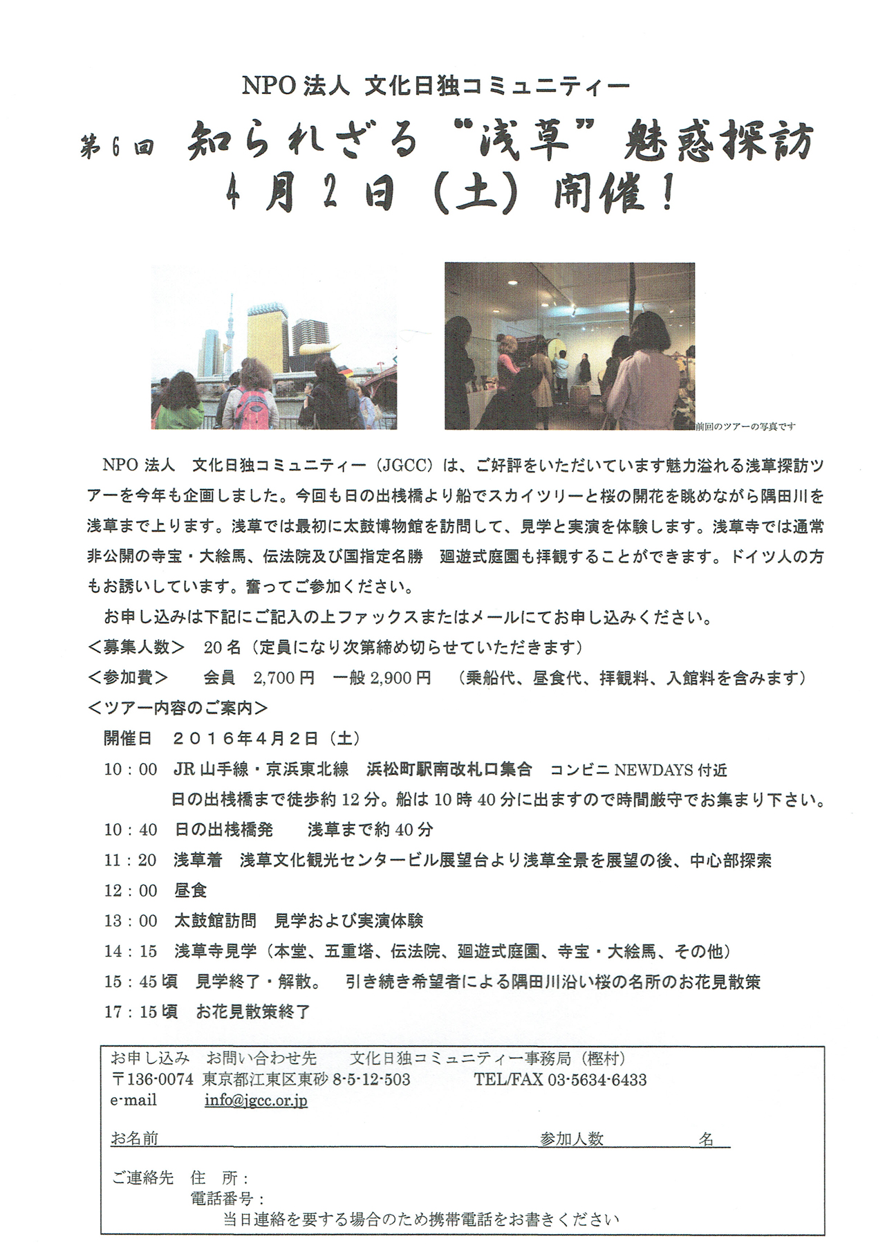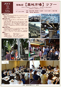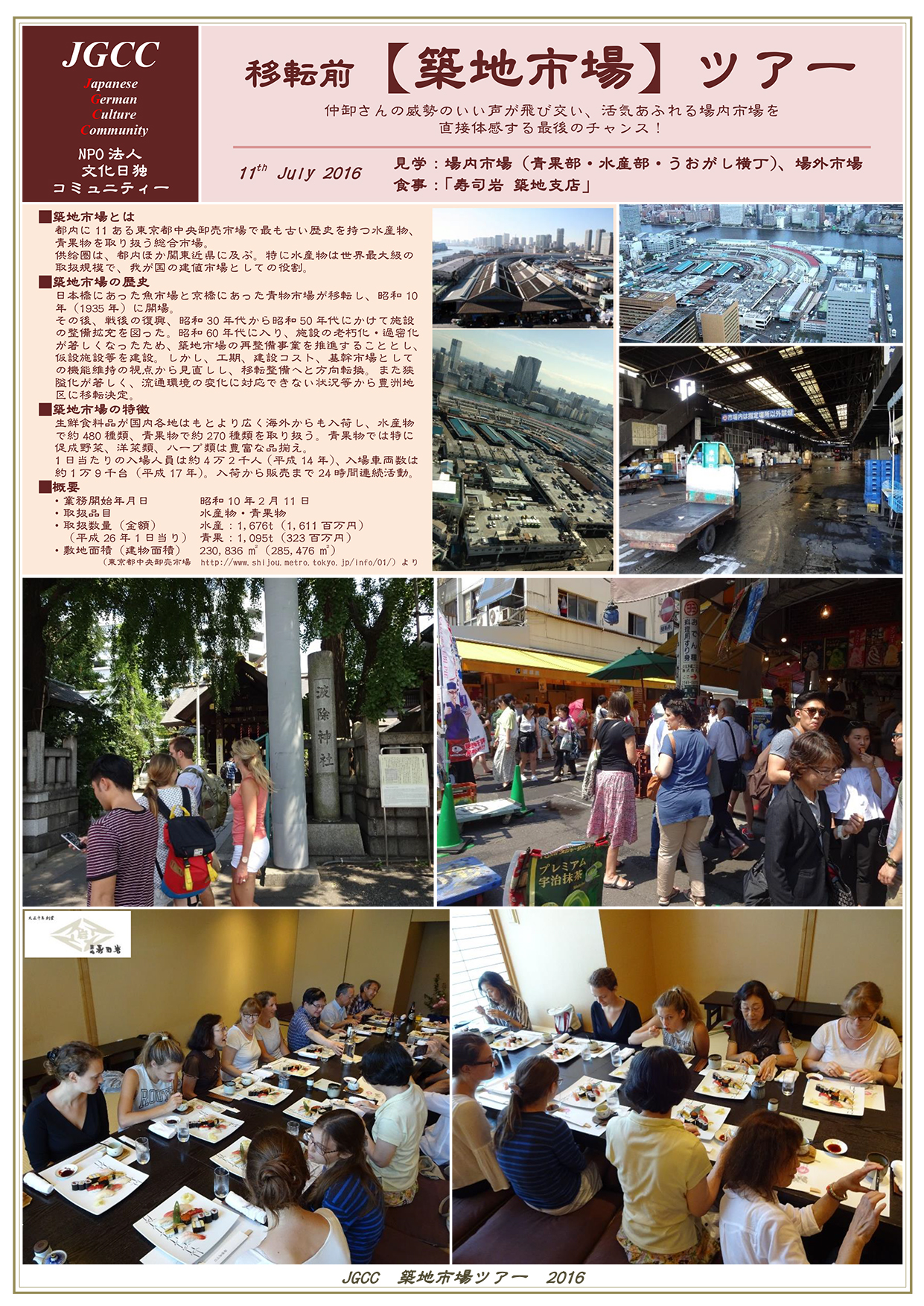 当日は良いお天気のもと、6人のドイツ人に参加していただき、場外市場を見た後、なかなか入る機会のない場内市場を見学しました。 4人のグループごとにガイドがつき、築地市場についての詳しい説明が聞けてとても有意義なツァーになり、ドイツの方達にも大変喜んでいただけました。 市場見学のあとは、おいしいお寿司屋さんで皆さんと歓談して楽しいひとときを過ごすことができました。 |
