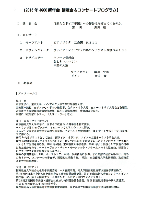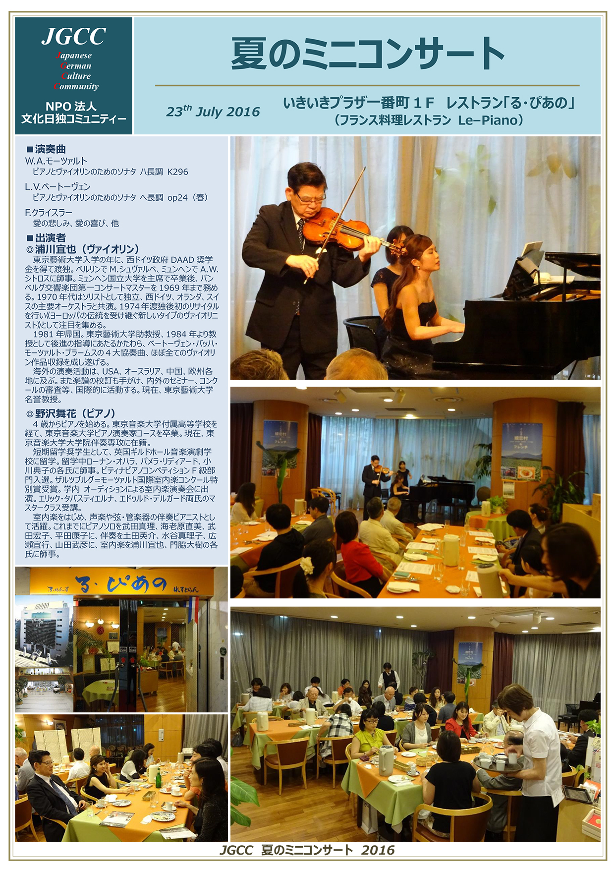 浦川宜也理事長のヴァイオリン、音大大学院生の野原舞花さんのピアノ伴奏でミニコンサートを行いました。 芸大名誉教授のヴァイオリンの大家の演奏に瑞々しいピアノ伴奏が合わさり、素晴らしい演奏会になりました。 演奏の合間には曲の説明もあり、より深くその曲を味わうことができました。 コンサートの後は、美味しいフランス料理を堪能することができ、皆さんに満足していただくことができました。 |